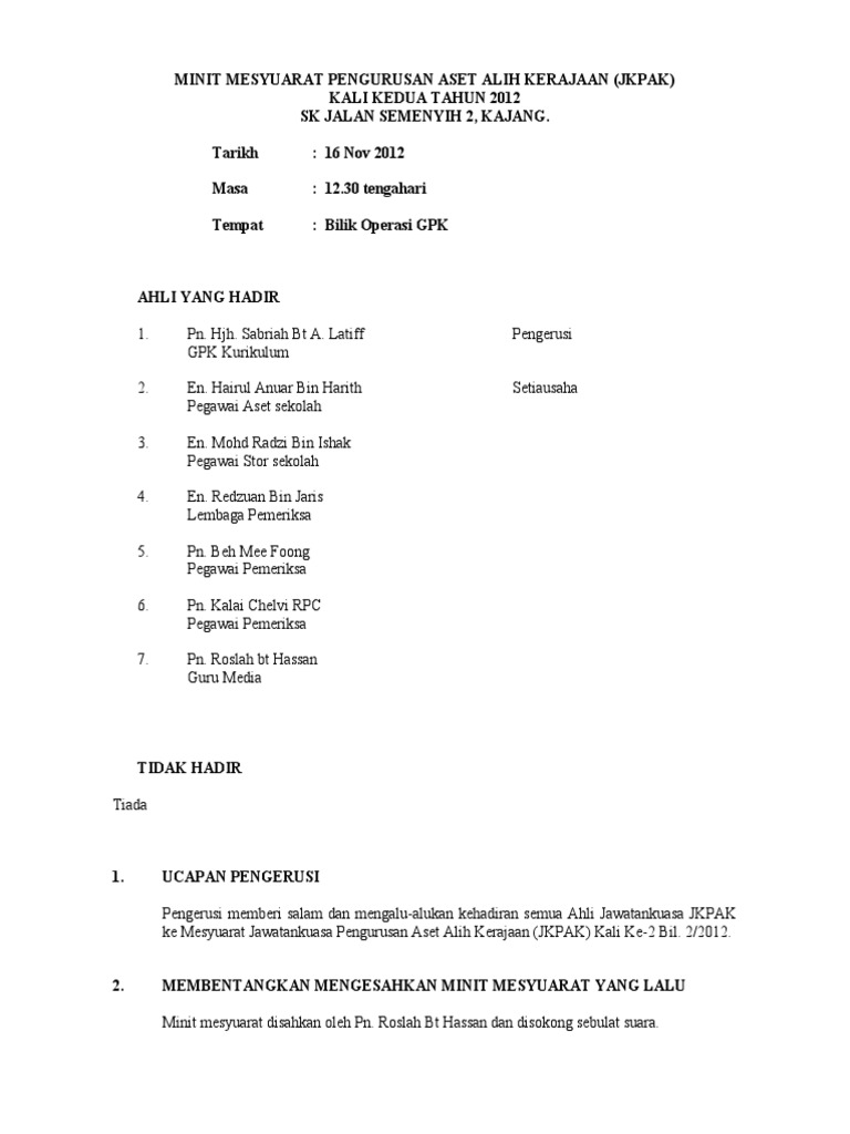 Pihak sekolah mengharapkan bahagian kewangan sekolah mesti mencapai ta hap baik, untuk itu beberapa perkara perlu dilakukan: Didalam sistem pendidikan di sekolah, terdapat pelbagai jenis mesyuarat yang bakal diadakan. Please fill this form, we will try to respond as soon as possible. Ini adalah contoh minit mesyuarat pengurusan sekolah yang mengikut format spsk mac 2012 jabatan pendidikan negeri johor darul takzim yang 7. Siti aloyah mengucapkan terima kasih atas kehadiran semua guru ke mesyuarat guru kali pertama.