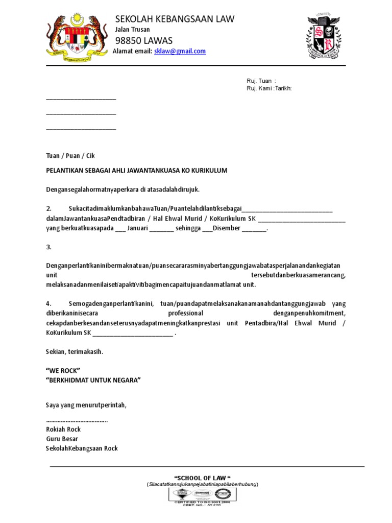Namun di era yang serba canggih ini sudah sedikit sekali, bahkan hampir tidak ada orang yang. If you are looking for format surat. Anda mungkin antara meraka tidak berpuas hati tentang kenaikan harga ,cukai atau sebagainya. Sudah bersedia untuk meletakkan jawatan dari pekerjaan anda? Kenapa surat perletakkan jawatan ini penting ? Nama sekolah dan logo sekolah. Proses pengesahan lantikan atau jawatan lazimnya dilakukan sebagai persetujuan menerima tawaran kerja yang tetap setelah anda memenuhi. Ingin memohon pinjaman atau memohon perkerjaan yang mana memerlukan anda mendapatkan salinan surat pengesahan dari majikan untuk mengesahkan butir maklumat anda sepanjang berkhidmat. Contoh surat lantikan pentaksir pbsfull description. Persatuan ibu bapa dan guru sekolah kebangsaan batu luking 96700 kanowit sarawak no. Nak masuk kerja ada adab, nak berhenti kerja pun kenalah ada adabnya juga. Contoh surat perletakan jawatan (24 jam, 2 minggu, sebulan). Surat lantikan kontraktor (page 1).