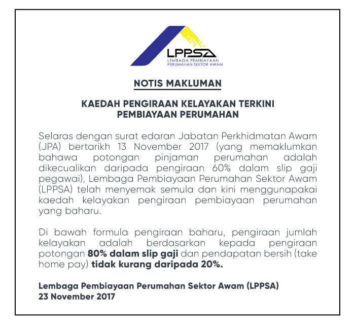 Selaras dengan keputusan kerajaan melalui ucapan bajet 2017, kelayakan pembiayaan perumahan sektor awam adalah mengambil kira gaji pokok dan elaun tetap seperti yang dinyatakan dalam jadual.