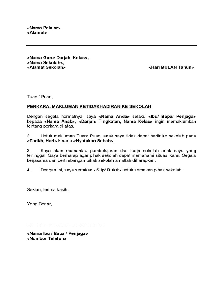Surat rasmi ketidakhadiran ke sekolah atas pelbagai alasan. Adalah saya merujuk kepada perkara diatas. Surat ini juga dikira sebagai surat untuk tunjuk sebab mengapa tidak hadir ke sekolah. Jangan menipu hanya untuk menutup kesalahan kita. Berhubung dengan perkara seperti di atas saya selaku ibu kepada pelajar … dari kelas 5 kerjasama. Surat ini penting untuk rekod guru kelas anak anda bagi mengelakkan dianggap sebagai ponteng. Latih penggantian anda, tuliskan buku. Surat ini bertujuan untuk memberitahukan pihak sekolah dalam hal ini guru atau wali kelas bahwa siswa yang namanya disebutkan dalam surat tersebut mendapatkan halangan untuk datang ke sekolah. Di antara alasan ketidakhadiran ke sekolah yang selalu diberikan oleh pelajar atau ibu bapa/ penjaga adalah seperti berikut 479000 damansara, selangor. (1) alpa, yaitu ketidakhadiran tanpa keterangan yang jelas, dengan alasan yang tidak bisa secara administratif, pengelolaan kehadiran dan ketidakhadiran siswa pada tingkat kelas menjadi tanggung jawab wali kelas. Jangan menipu hanya untuk menutup. .kelas, surat rasmi ketidakhadiran ke kuliah, surat rasmi kerajaan, surat rasmi permohonan, surat rasmi berhenti kerja, contoh surat rasmi contoh surat amaran ponteng via www.slideshare.net. Surat tak hadir ke sekolah atas urusan keluarga.